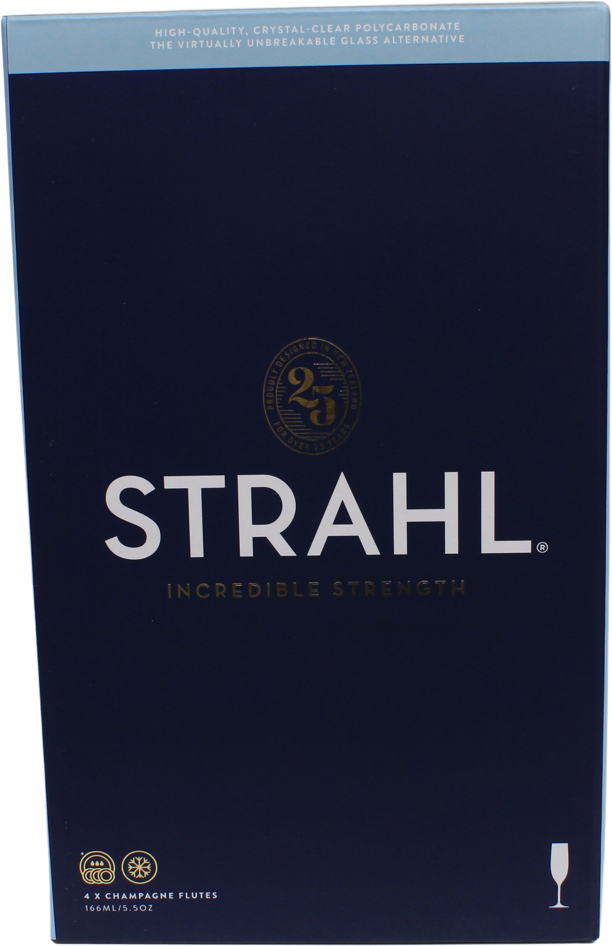 Strahl har på sine glass fjernet maskinelle skjøter for hånd. Dette gir en utrolig flott finish.Polykarbonat har samme eleganse og klarhet som glass, men er uknuselig.