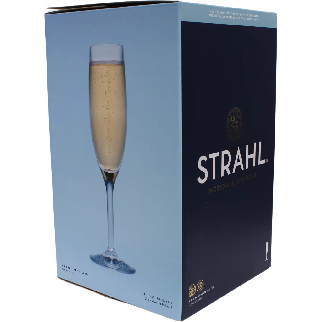 Lekre champagneglass i gaveeske produsert i uknuselige glass i polykarbonat fra Strahl, perfekt til camping eller båttur.