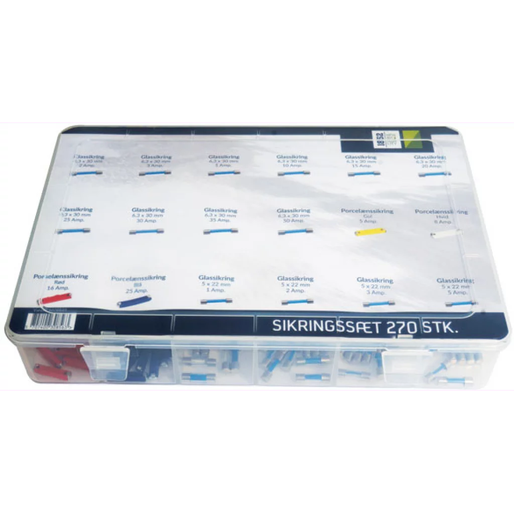 Komplett sortimentsboks med 270 proselen- og glassikringer. Settet inneholder 18 forskjellige sikringer fra 1 til 50 A, 15 stykk av hver type. Skringene leveres i en praktisk boks.