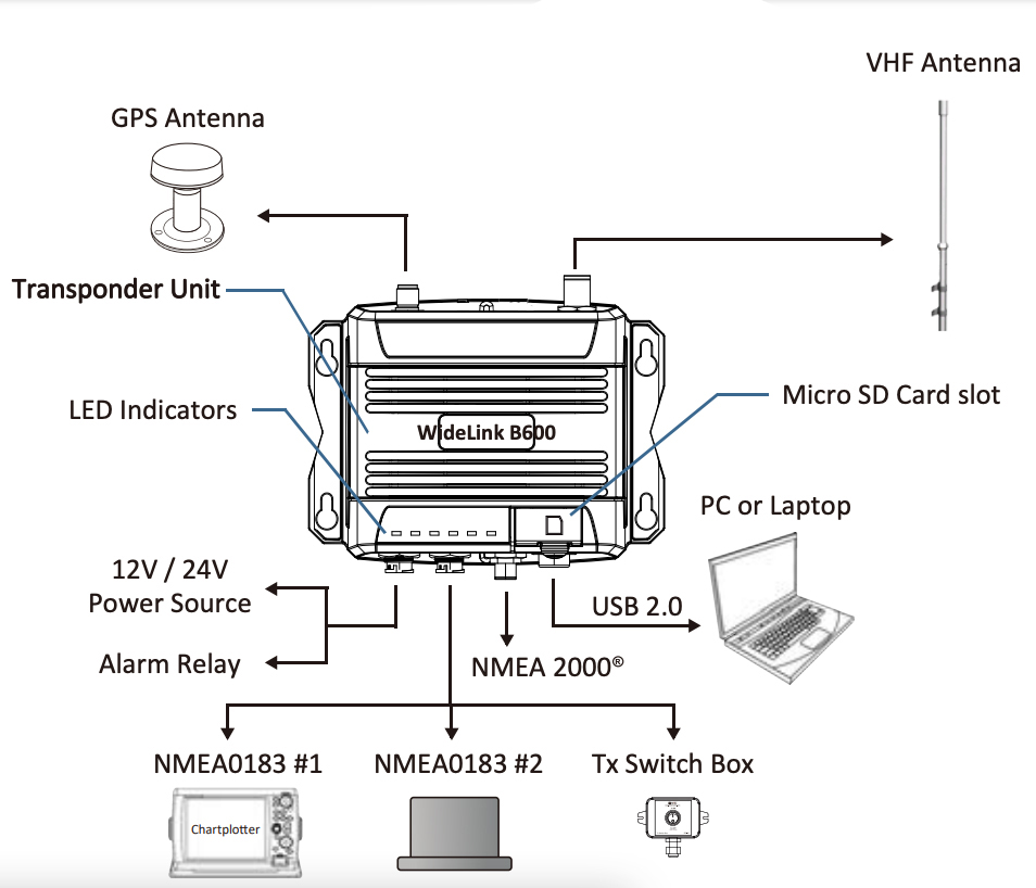 Widelink B600 har 5W sendereffekt, integrert GPS, flerkanalsmottaker, og kan motta signaler både fra Klasse A og Klasse B AIS. Den kan lett kobles opp mot kartplotter og PC via NMEA2000/0183 eller USB.