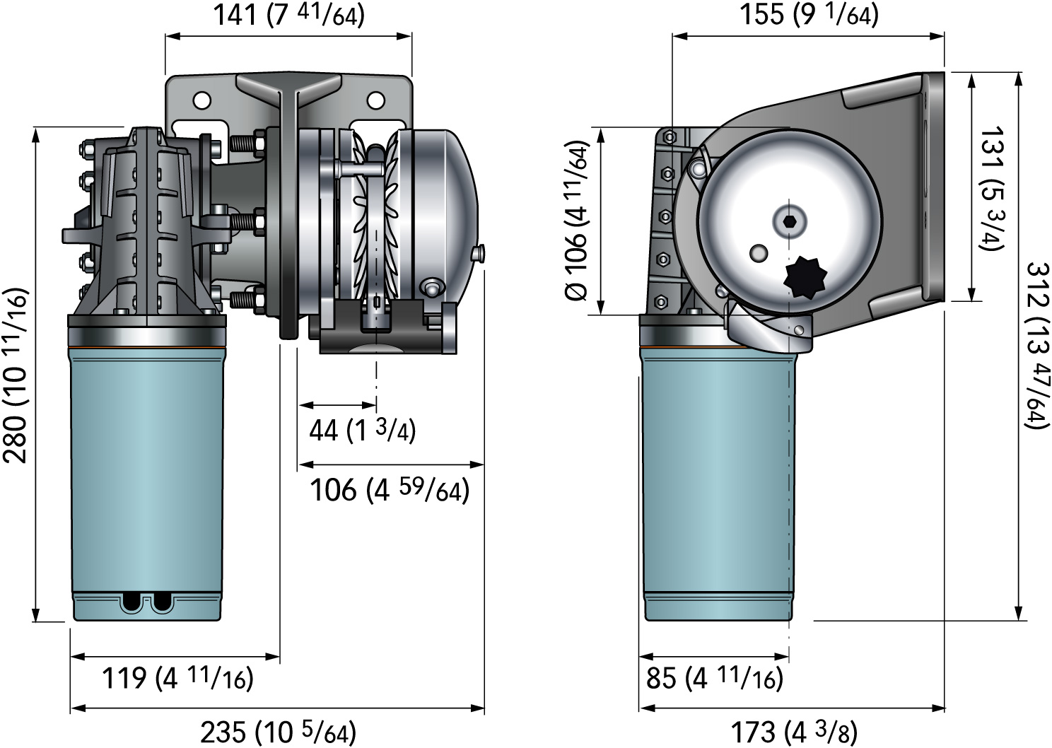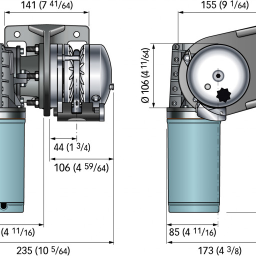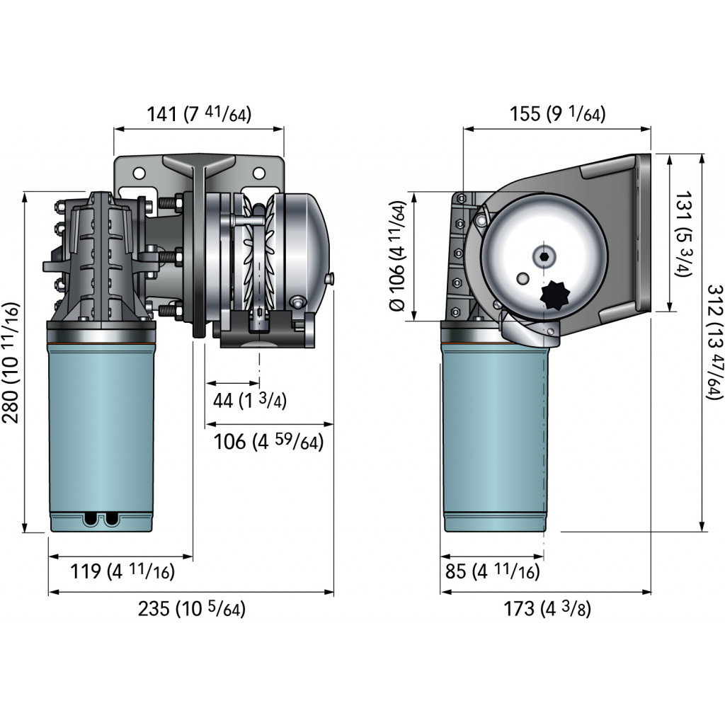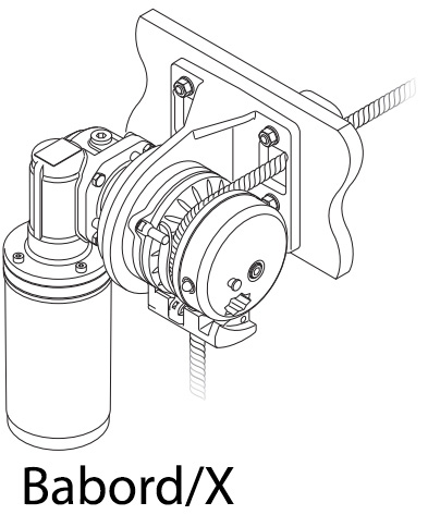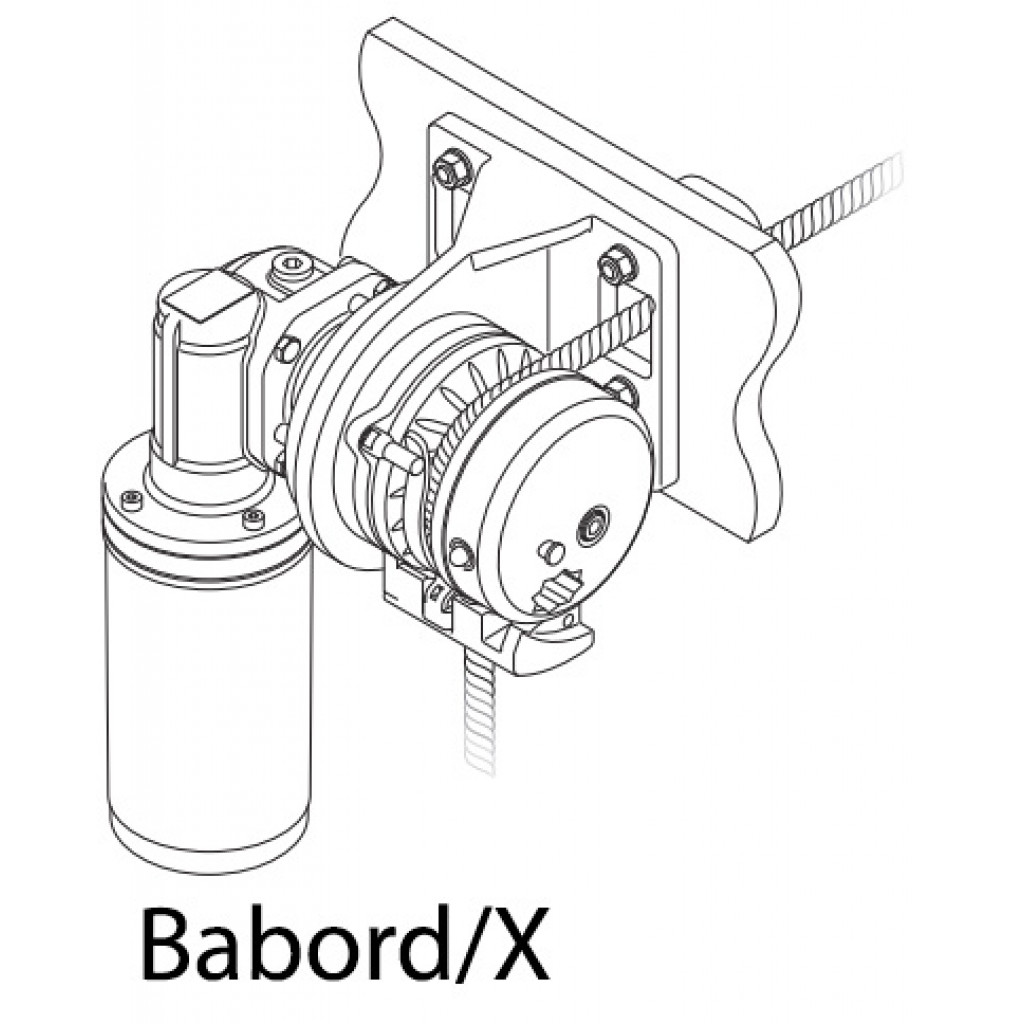 Vinsjen er av modell X, det vil si at taukabelaret er plassert på babord side av motoren, som avbildet.