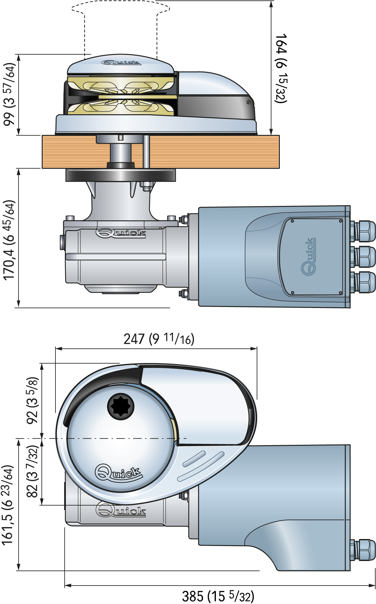 Delen over dekk er i hovedsak laget i høyglanspolert syrefast stål med kabelar i forkrommet bronse. Denne materialkombinasjonen gjør at vinsjen er svært korrosjonsbestading, og holder seg vakker over tid. Motoren og gearboksen er vanntett (IP66/IP67).