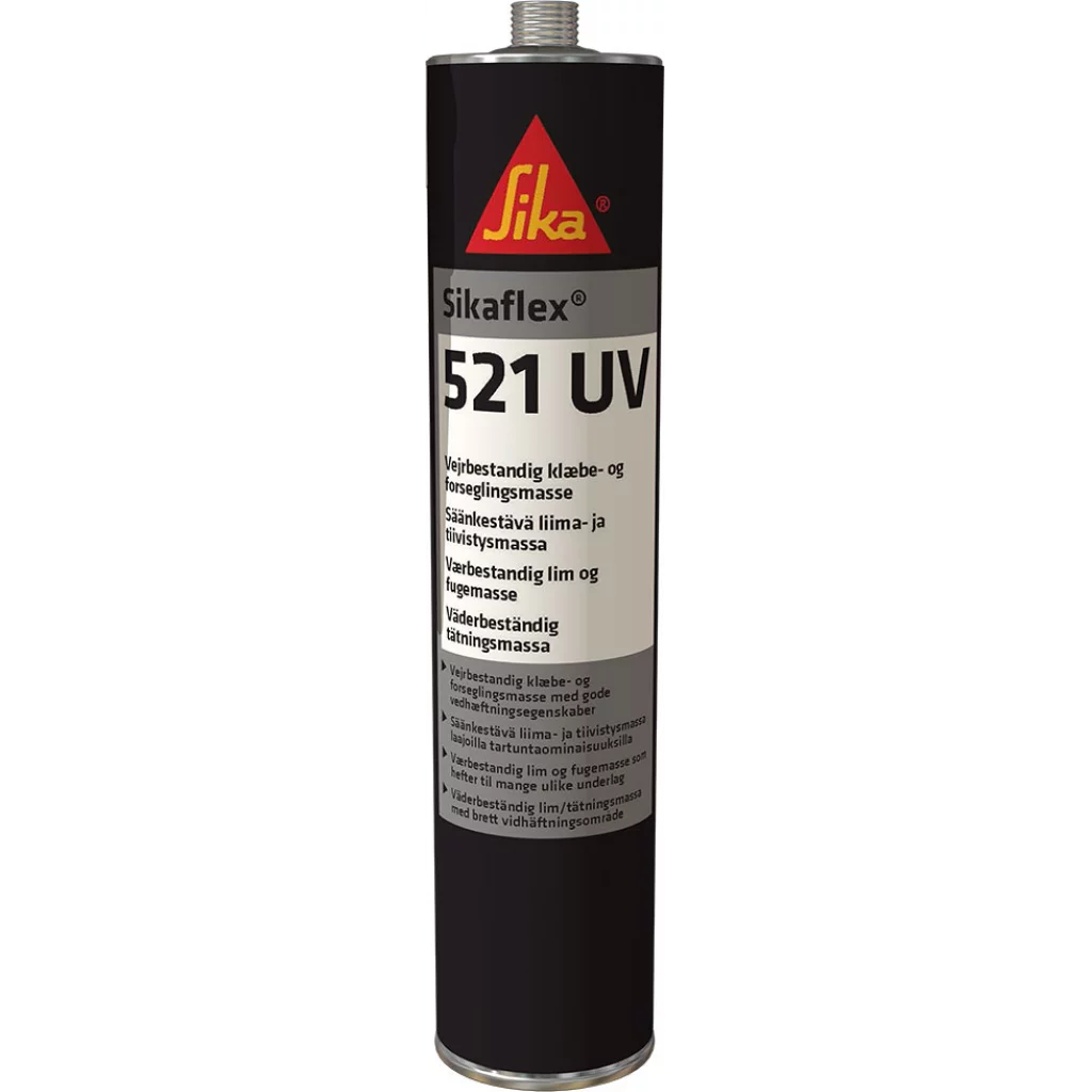 Sikaflex-521 UV er en værbestandig, 1-komponent silanterminert polymer (STP) fugemasse som herder ved kontakt med luftfuktighet. Dette universalproduktet er egnet for både innen- og utendørs fugetettinger.